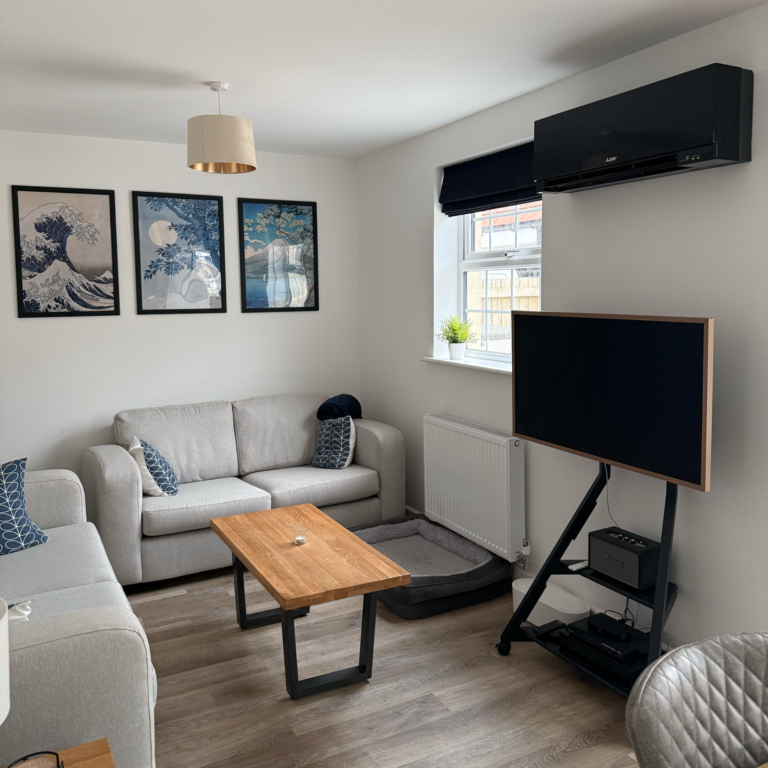 We installed this multi-split system into a home, to heat and cool the master bedroom and living room. Connected to one outdoor unit, to keep external units to a minimum. The customer chose wall mounted systems, but selected different colours to match decor.