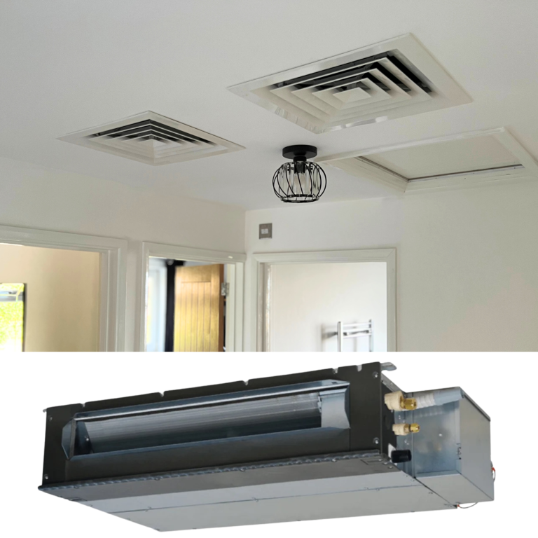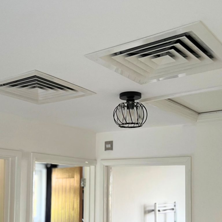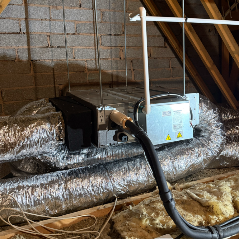 This bungalow was undergoing rennovation, and needed a replacement for its inefficient electric storage heaters. We installed this ducted system to provide heating and cooling, with a SCOP of 4.10. With the unit situated in the loft, there were no ac units on show from liveable areas. Only ceiling air diffusers.